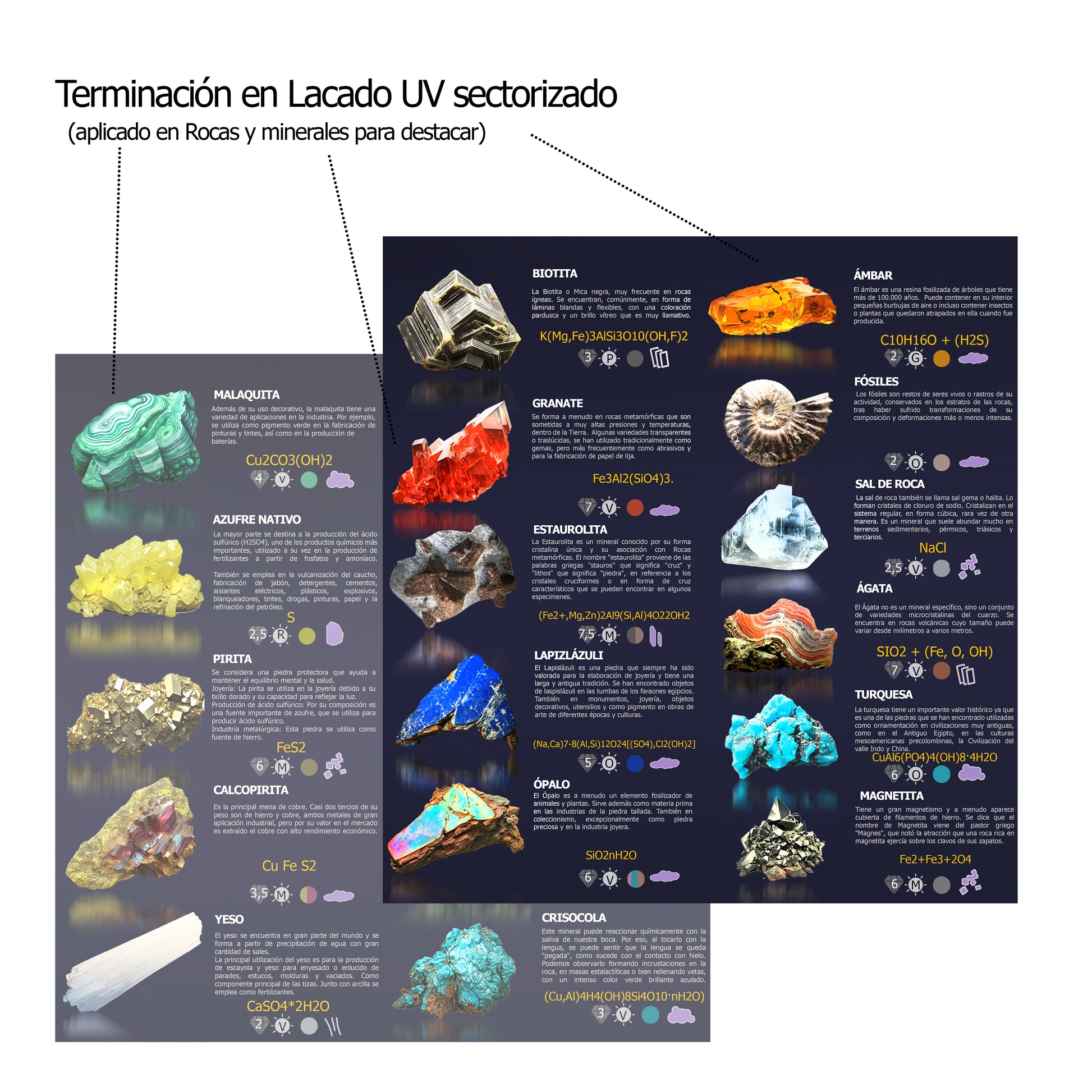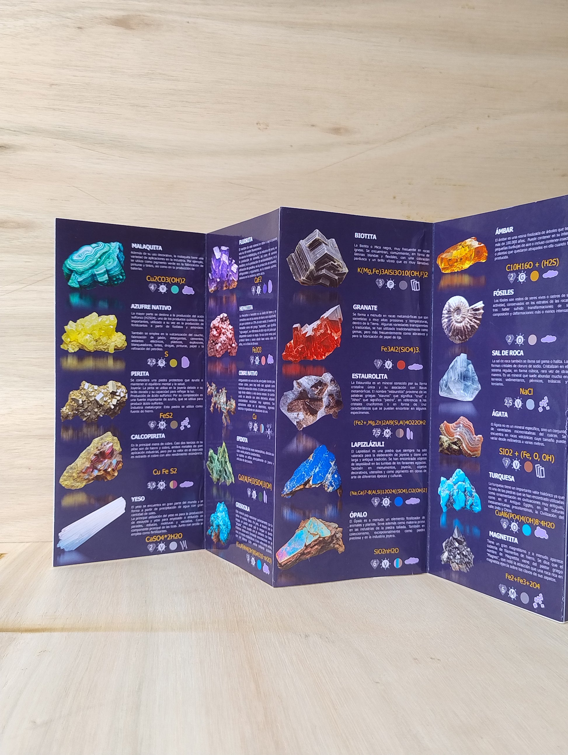 Una guía diseñada con todo el amor y cariño y que estamos seguro te la vas a disfrutar. Al igual que nuestros otros productos del mismo estilo esta guía posee terminaciones aptas para el uso en terreno. además viene con una terminación en laca sobre los minerales y otros gráficos lo que destacará aun más estos elementos dentro de la guía.